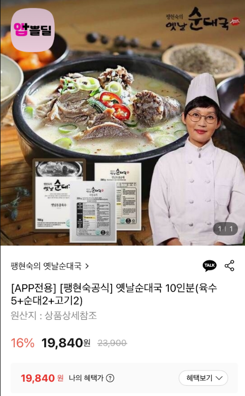 팽현숙 공식 옛날순대국 10인분 19,840원